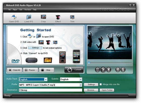 Nidesoft DVD Audio Ripper - удобный инструмент для излечения аудиодорожки из DVD. Поддерживаются форматы MP3, WAV, WMA, AAC, AC3, OGG. Программа имеет простой понятный интерфейс и экономит ваше время при рутинных операциях по конвертации в разные форматы.