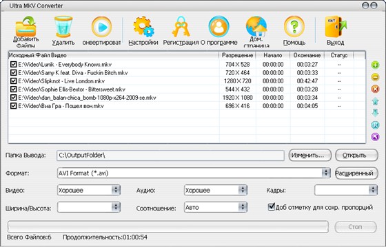 Ultra MKV Converter - профессиональный MKV конвертер, который может конвертировать MKV в AVI, MPEG, WMV, DVD, MP4, 3GP, H264, FLV, IPod, PSP, Archos и т.д. Благодаря простому и дружественному интерфейсу, вы сможете легко преобразовать MKV во все популярные видео форматы. Вам не нужно устанавливать другие кодеки или фильтры для преобразования MKV файлов. Всего за несколько кликов вы можете выбрать аудиодорожку и субтитры. Высокая скорость конвертования и высокое качество. Программа имеет мультиязычный интерфейс, включая русский язык.