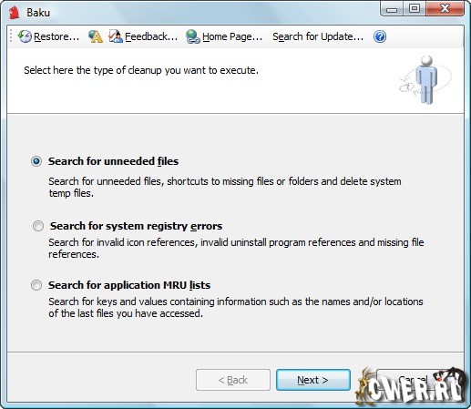 Программа со столь оригинальным названием занимается уборкой мусора с вашего компьютера. Она чистит реестр, удаляет временные файлы, очищает MRU-списки, дефрагментирует реестр. Перед удалением записей из реестра Baku делает его резервную копию.