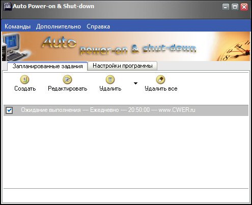 Auto Power-on & Shut-down - программа для автоматического включения/выключения компьютера, без захода в BIOS. Программа позволяет выставить правило "включить машину", на определенные дни недели и время (c точностью до секунды). Сразу после включения, программа может запретить доступ к машине или через определенное время его заблокировать, поддерживает большинство системных плат формата ATX. Главная фишка - встроенный планировщик. Позволяет выбрать определенный день в году, месяц, неделю, время (разово или постоянно) для: выключения, спящего или ждущего режима, перезагрузки, блокировки, пробуждения, открытия/закрытия программы, соединения с сетью, проигрывания звукового файла (нескольких форматов) или вывода настраиваемого сообщения.