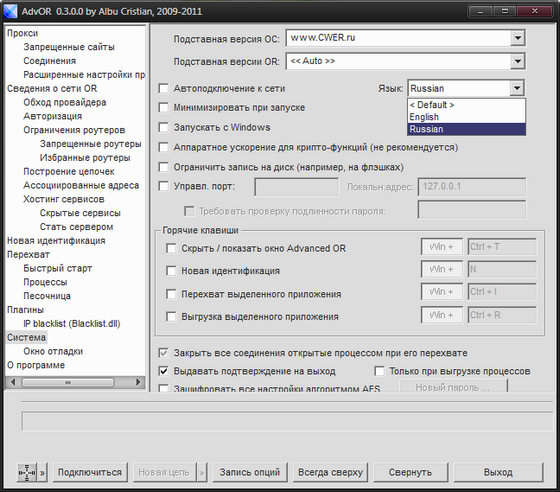 Advanced Onion Router — это клиент для сети Tor, предназначенный для улучшения стандартного комплекта Tor + Vidalia + Polipo для пользователей Windows. Он способен заставлять программы и плагины принудительно использовать прокси-Tor, независимо от его настроек прокси-сервера.