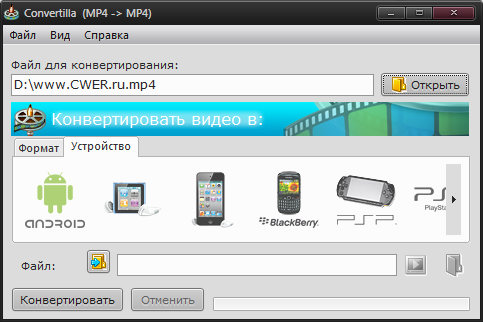 Convertilla это простая и удобная программа для конвертирования видео и музыки из одних форматов в другие. Поддерживаются: MP4, FLV, MKV, MPG, AVI, MOV, WMV, 3GP, MP3.