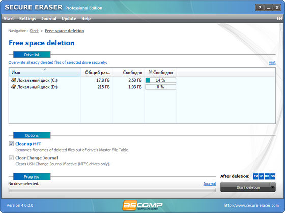 Secure Eraser - основное предназначение программы - удаление конфиденциальной информации пользователя с жесткого диска без возможности восстановления. Программа сразу после удаления информации перезапишет освободившиеся секторы несколько раз производной комбинацией символов, так что для восстановления информации понадобятся специальные аппаратные средства. Помимо надёжного удаления данных, в программе присутствует возможность очистки файлов во временных папках системы и IE, затирание неиспользованного (свободного) пространства дисков, а также очистка реестра от ненужных записей. Для безвозвратного удаления файлов можно выбрать один из следующих известных и признанных стандартов: US DoD 5220.22-M E, US DoD 5220.22-M ECE, German standard, Peter Gutmann standard. Начать безвозвратное удаление файлов можно прямо из контекстного меню Explorer или Корзины.