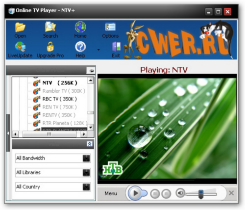 Программа для просмотра более 850 Internet TV каналов и прослушивания более 1500 Internet радио каналов. Для нормального просмотра скорость интернета должна быть не менее 64Кбит/с (желательно 256Кб/с и выше). Также с помощью Online TV Player можно просматривать музыкальные клипы из разных источников. В программе доступна запись звука в форматах WAV, OGG и MP3.