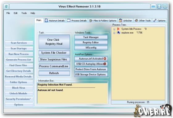Virus Effect Remover - это инструмент который поможет вам справиться с последствиями вирусной аттаки, повлекшей за собой изменение в Реестре Windows и Файловой системе. Так же определяет ошибки реестра сделанные вирусом и делает доступными: диспетчер задач, редактор реестра, свойства папки, и т.д.