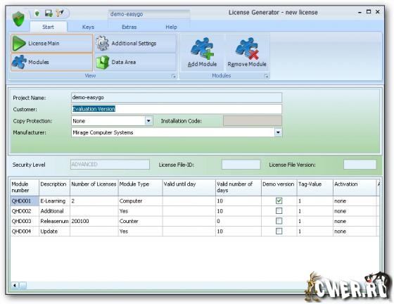 - Build Keys with predefined settings like Serial Number, Unlock Key or keys for additional modules