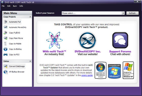 DVD neXt COPY neXt Tech - программа для копирования DVD. Программа позволяет делать резервные копии DVD фильмов. Предпросмотр трэков перед и во время копирования, поддержка однослойных и двухслойных дисков, мультиканального звука (Dolby digital 5.1, dts), поддержка NTSC и PAL DVD фильмов, делают эту программу одной из лучших в своём классе.