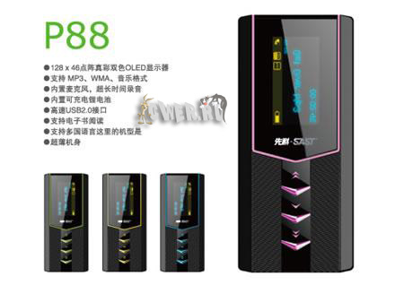 AY-P88 привлекает довольно лаконичным и в то же время очень стильным дизайном с тремя «диамантовыми» клавишами. Из технических характеристик отметим 1-дюймовый OLED экран, поддержку основных популярных аудио форматов, встроенный микрофон, FM-приёмник (опционально), время автономной работы до 10 часов. Новинка будет представлена в четырех цветовых оформлениях (синем, красном, зеленом и желтом).