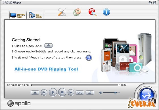 Apollo No1 DVD Ripper - программа предназначена для создания копий DVD-фильмов. Позволяет конвертировать видео DVD в форматы VCD (MPEG1), SVCD (MPEG2), AVI и DivX (MPEG4). Поддерживается пакетная обработка файлов, конвертирование отдельного куска DVD, конвертирование с отличным качеством или подгонка под размер конечного файла, а также имеется поддержка выключения компьютера после завершения работы. В связи с несложностью интерфейса очень подходит для домашнего использования. Позволяет максимально удобно настроить рабочую среду. Имеет простой и понятный пользовательский интерфейс с многоязычной поддержкой, включая поддержку русского языка.