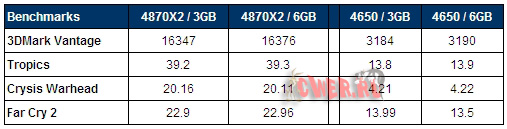 Для сравнения последовательно были собраны четыре разные конфигурации, отличающиеся объемом памяти (3 или 6 гигабайтных планок Kingston HyperX DDR3-1800) и видеоподсистемой (Sapphire Radeon HD 4650 или Palit Revolution 700 Radeon HD 4870 X2). В основе каждой системы – плата ASUS Rampage II Extreme и процессор Core i7 920, разогнанный до 4 ГГц. Всё «железо» работало под управлением Windows Vista 64 SP1, также были установлены драйвера Catalyst 8.11.