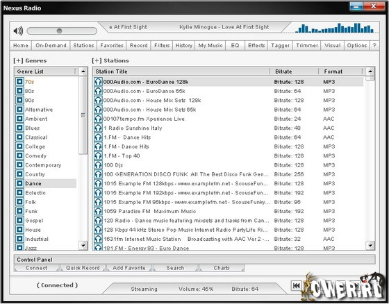 Nexus Radio – не просто плеер онлайн-радио, помимо целого ряда функций и стильного графического интерфейса, программа поддерживает 8000 интернет-станций. С помощью Nexus Radio можно не только слушать музыку любого стиля, но и записывать дорожки из эфира в MP3 формат. Никаких трудностей данная операция не вызовет. Трек записывается не только при нажатии на кнопку Record, но и в указанный период времени и даже день.