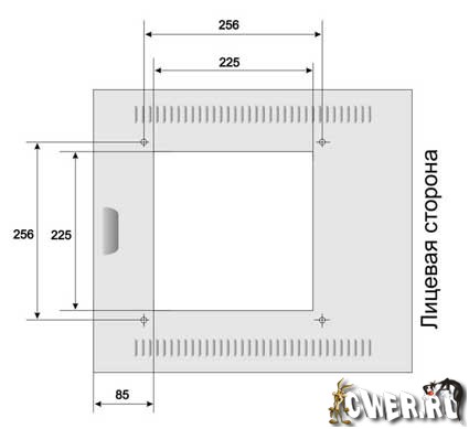 Значительную трудность представляет прорезание прямоугольного отверстия под кулер... В мастерских это отказываются делать, и я потратил довольно много времени, прорезая его бормашинкой и алмазным бором. Так же сложно сделать большое количество отверстий диаметром три миллиметра под светодиоды. Размеры отверстий под кулер я не привожу, так как можно применить любой, а можно и вообще без него, эффект от этого не снизится. Когда Вы решите проблемы со стёклами, приступайте к вырезанию окна в крышке системного блока. Стоит обратить внимание, что у меня вся конструкция смещена к задней части. Это связано с тем, что для зеркал нужно около двадцати миллиметров пространства, а в передней части находится отсек для винчестеров и CD-ROMa. Прорезанное окно и его разметка представлены на рисунках ниже.