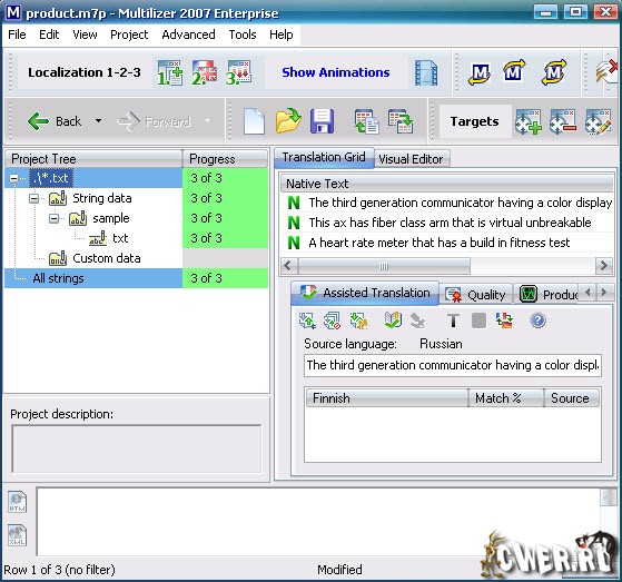 Multilizer - мощная по своим возможностям программа для создания локализаций приложений, а проще говоря, для перевода менюшек программ и всего остального на другие языки. Multilizer понимает большое количество форматов, различает тип языка программирования, на котором написана программа, позволяя редактировать программы, предназначенные для разных операционных систем - Windows, Windows.NET, 16-bit Windows, Windows CE, Java, Palm, Symbian и т.п. Программа поддерживает большое число опций, позволяющих не то что без особого труда, но даже с комфортом, заниматься локализацией, в том числе имеется функция импорта в проект уже готовых переводов.