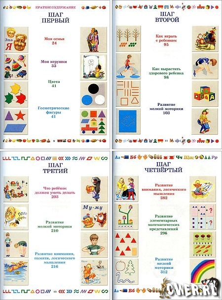 Книга разделена на четыре части - четыре "шага", каждый из которых соотносится с определенным периодом развития ребенка. Первый шаг соответствует примерно третьему году жизни, второй - четвертому, третий - пятому и, наконец, четвертый - шестому году. Таким образом, Энциклопедия шаг за шагом подводит ребенка к моменту поступления в школу.
