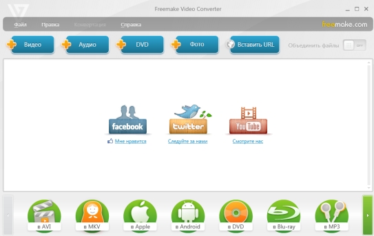 Freemake Video Converter – это бесплатное универсальное приложение, которое предлагает вниманию пользователей инструменты для быстрого конвертирования видеоматериалов в распространенные форматы, их последующего редактирования и записи на оптические носители. С помощью Freemake Video Converter энтузиасты также смогут выполнять некоторые другие действия, например, подготавливать материалы к просмотру на специфических мобильных устройствах, создавать качественные слайд-шоу и извлекать звуковое сопровождение из понравившихся фильмов.