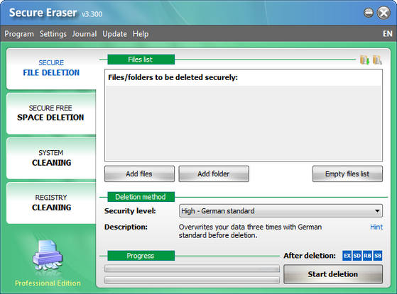 Secure Eraser - основное предназначение программы - удаление конфиденциальной информации пользователя с жесткого диска без возможности восстановления. Программа сразу после удаления информации перезапишет освободившиеся секторы несколько раз производной комбинацией символов, так что для восстановления информации понадобятся специальные аппаратные средства. Помимо надёжного удаления данных, в программе присутствует возможность очистки файлов во временных папках системы и IE, затирание неиспользованного (свободного) пространства дисков, а также очистка реестра от ненужных записей. Для безвозвратного удаления файлов можно выбрать один из следующих известных и признанных стандартов: US DoD 5220.22-M E, US DoD 5220.22-M ECE, German standard, Peter Gutmann standard. Начать безвозвратное удаление файлов можно прямо из контекстного меню Explorer или Корзины.