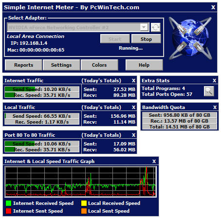 BWMeter - лучшая из утилит для подсчета трафика. Настраиваемые фильтры для разделения трафика по портам и ip-адресам. И в то же время очень простой интерфейс. Программа по умолчанию разделяет трафик на локальный и интернетовский, что и требуется в 90% случаев. Умеет выводить графики по каждому из фильтров. Показывает отчеты за день, неделю, месяц и год. Благодаря гибкости настроек может быть использована для подсчета трафика каждого из нескольких компьютеров, находящихся в одной сети, будучи установленной только на одном из них (зависит от конфигурации сети)