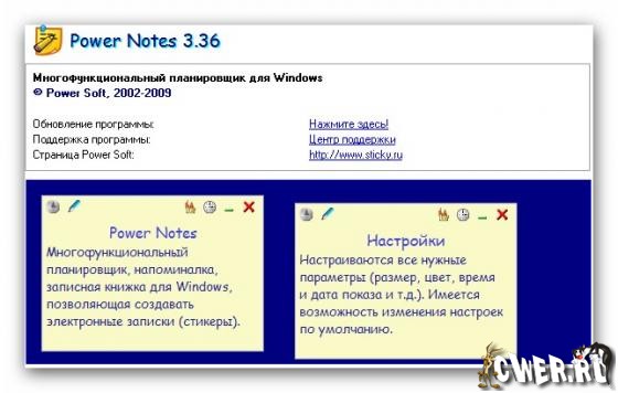Программа Power Notes - это многофункциональный планировщик, напоминалка, записная книжка для Windows, позволяющая создавать электронные записки (стикеры) и показывать их в нужный момент времени. Программа очень проста в освоении и нетребовательна к ресурсам.